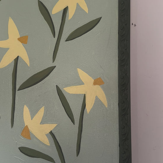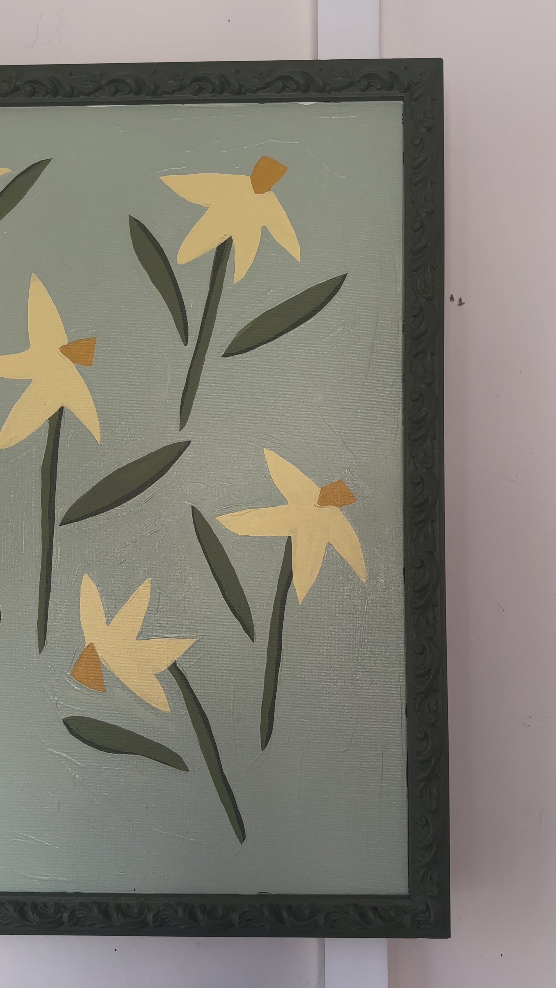This piece was inspired by that first day in March every year when the daffodils finally burst open, and you can smell that winter is finally behind you! It has a gorgeously detailed, deep frame, and the original sunflower print is saved on the back from when I thrifted the frame.